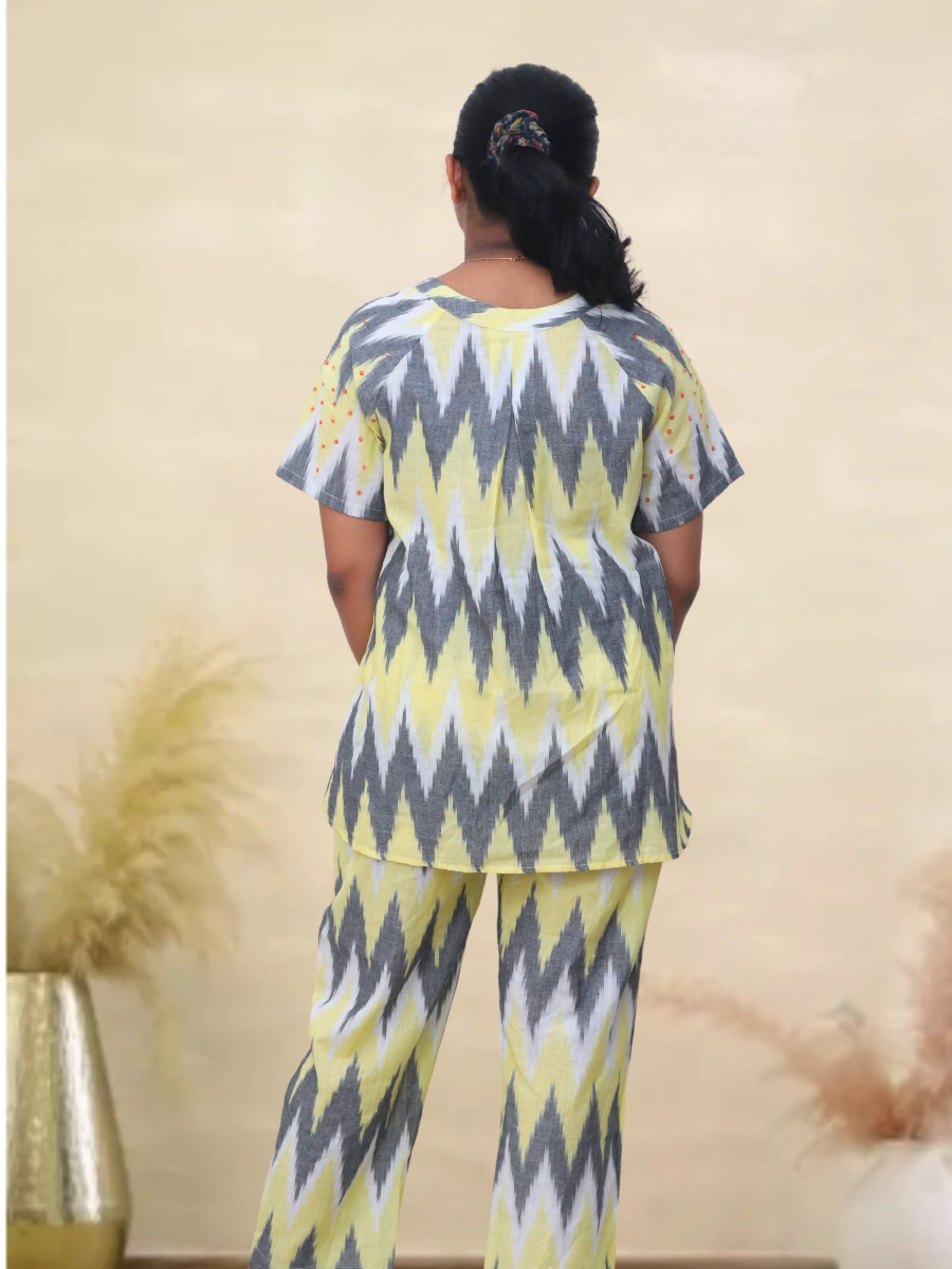 An Ikat cord set is a coordinated outfit made from handwoven Ikat fabric, featuring its signature blurred patterns. Stylish and comfortable, it’s perfect for casual outings or semi-formal occasions, offering a chic and effortless look.
