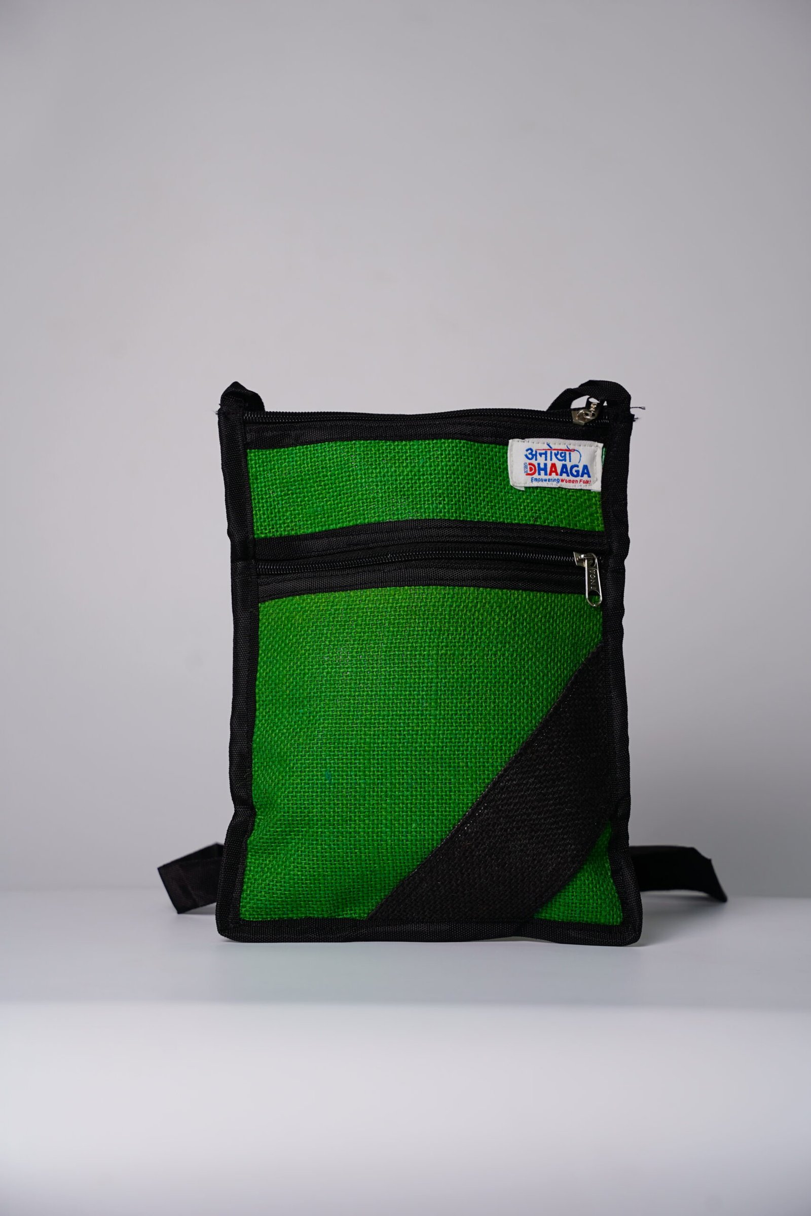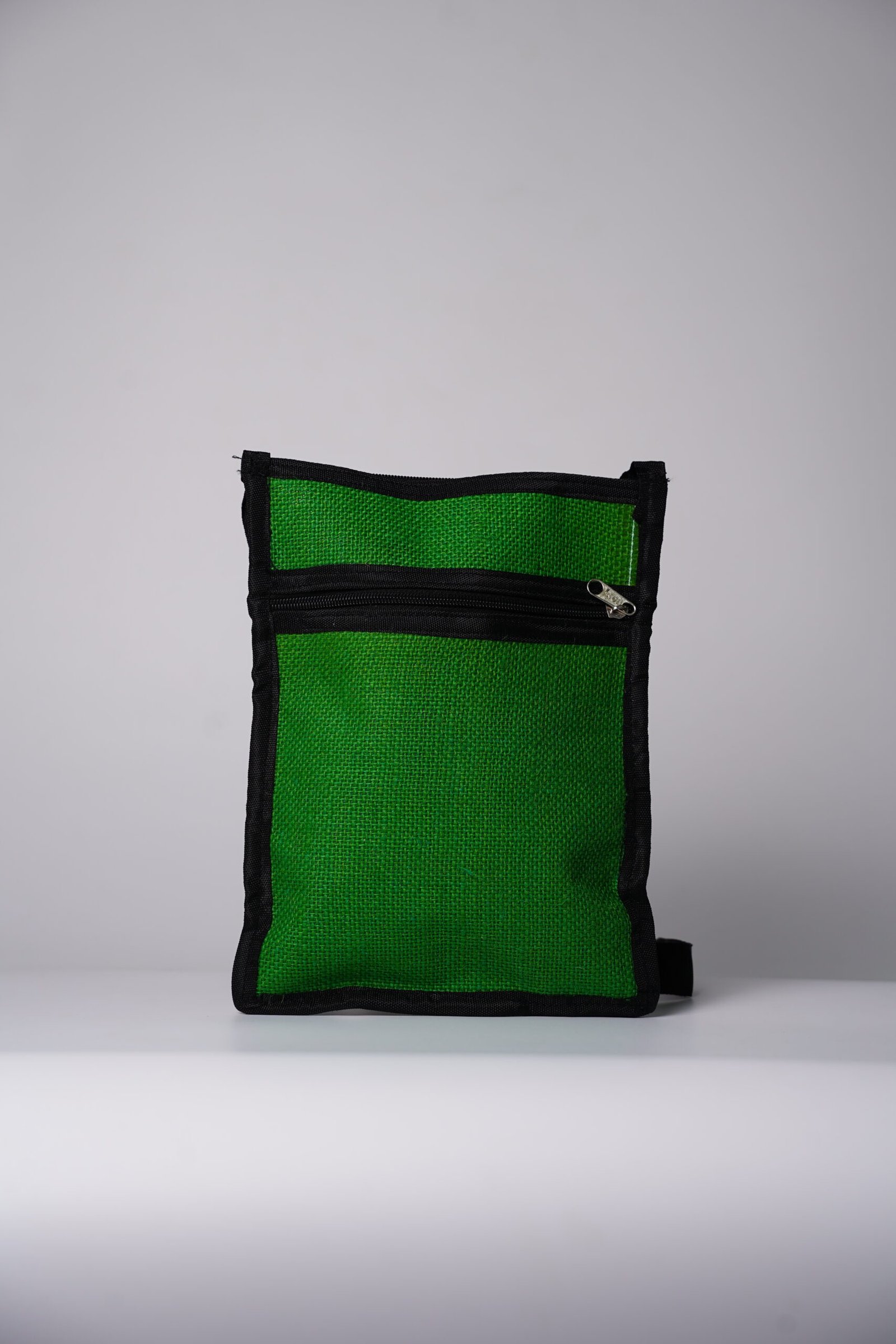 Carry your essentials in effortless style with this eco-friendly jute sling bag. Crafted from durable natural jute fabric, the bag features a rich green body accented with smart black borders for a clean, contemporary look. Designed for everyday convenience, it comes with multiple zippered compartments to keep your belongings organized and secure.