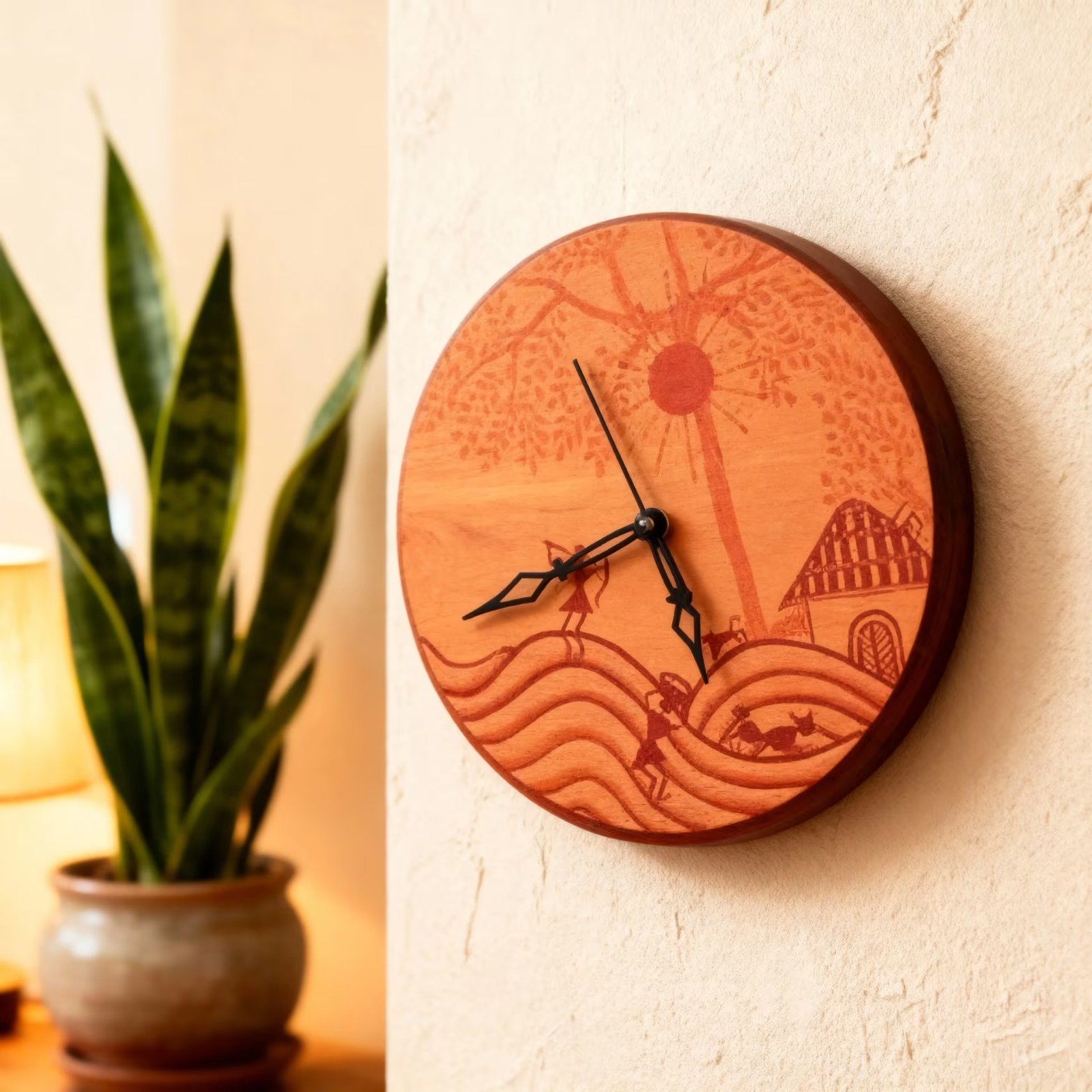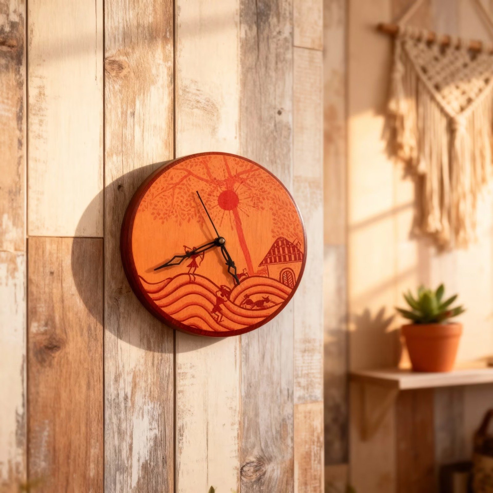 This Handcrafted Wooden Wall Clock is a beautiful piece of home decor that combines function with the look of traditional Japanese art. Made from wood, it features a scenic landscape inspired by Mount Fuji, cherry blossoms, and waves. With its warm coral orange and earthy tones, it adds a natural and artistic touch to any room. Not only does it tell time clearly, but it also makes your space look more interesting and cultural. Perfect for those who love Japanese themes or want a unique decorative piece, this clock fits well in living rooms, bedrooms, or offices. Its simple style helps it blend with many interior designs while giving your wall a special look.
