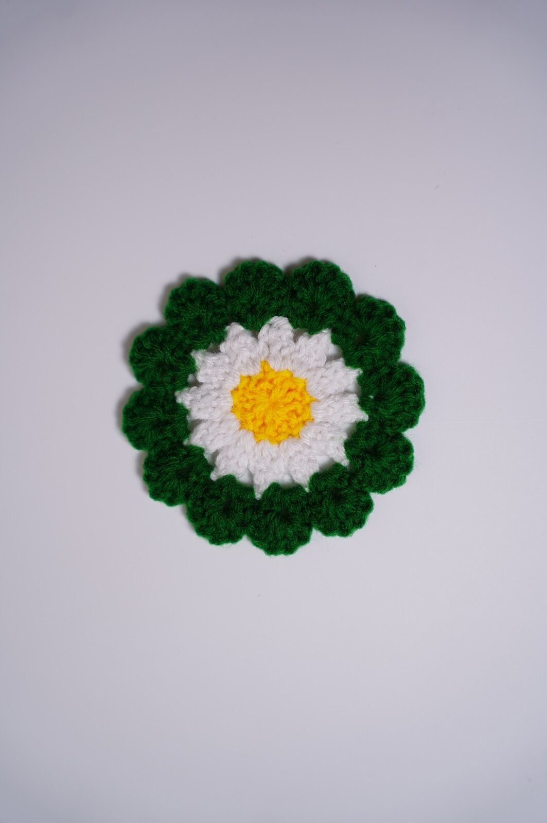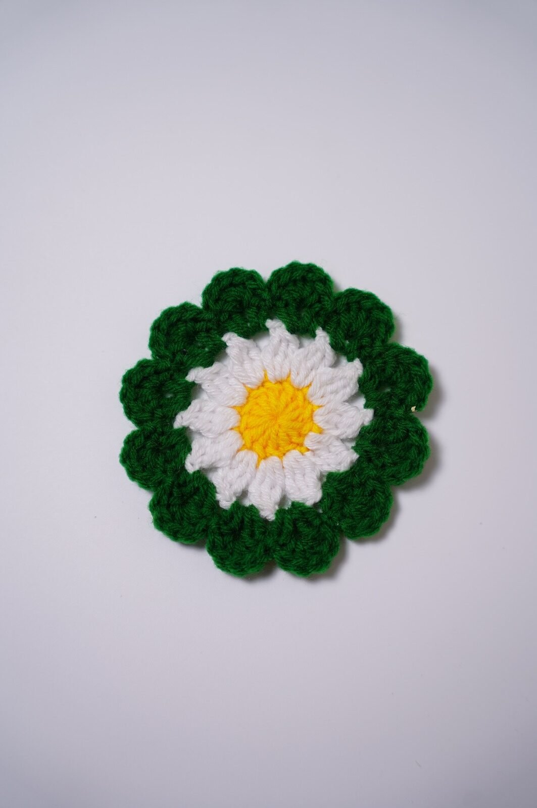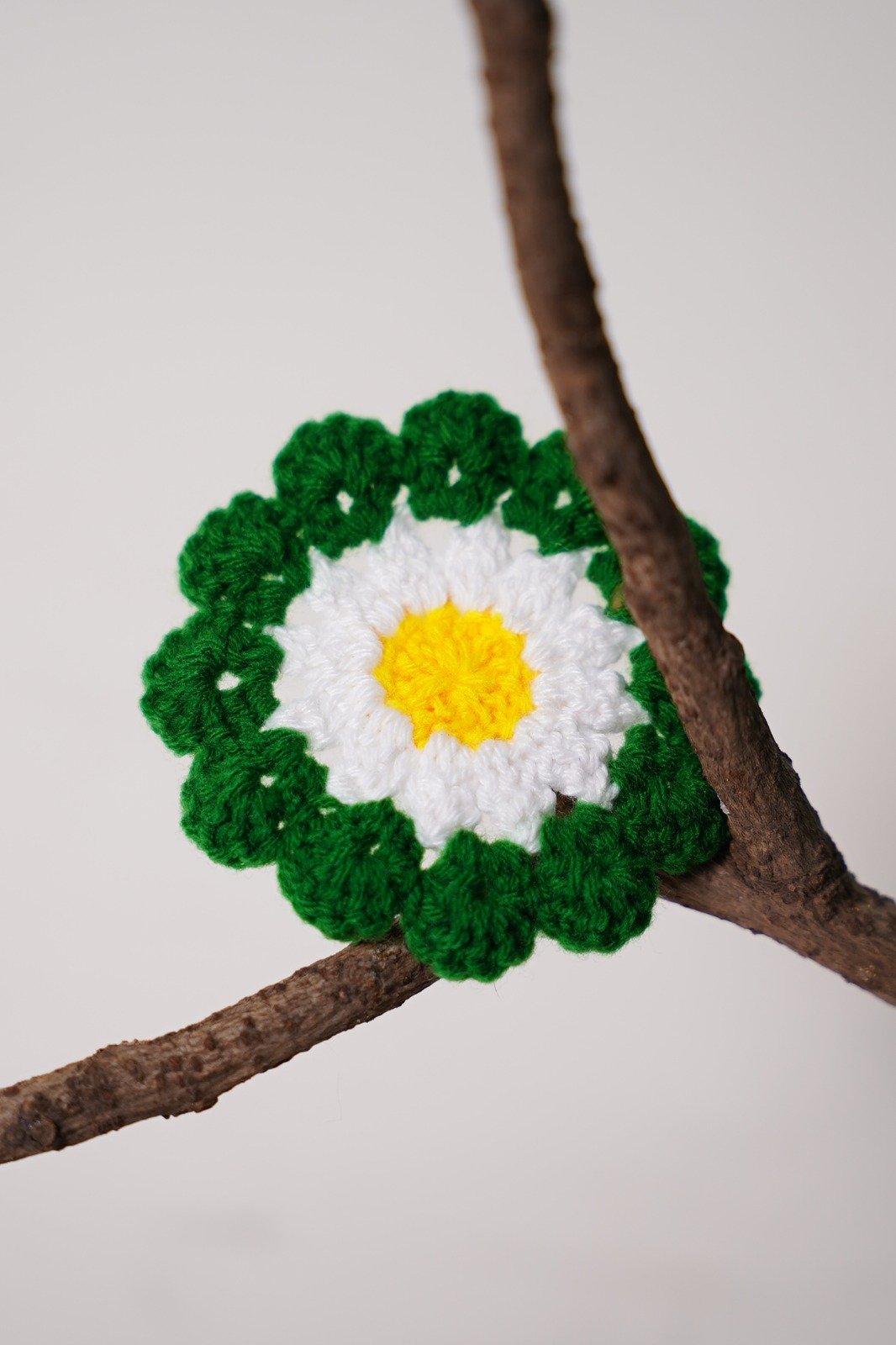 The crochet daisy flower is hand-woven using soft, high-quality yarn, forming neat, symmetrical stitches. It features a bright, textured center—often in yellow—surrounded by evenly shaped white or pastel petals that radiate outward, perfectly capturing the cheerful look of a natural daisy.