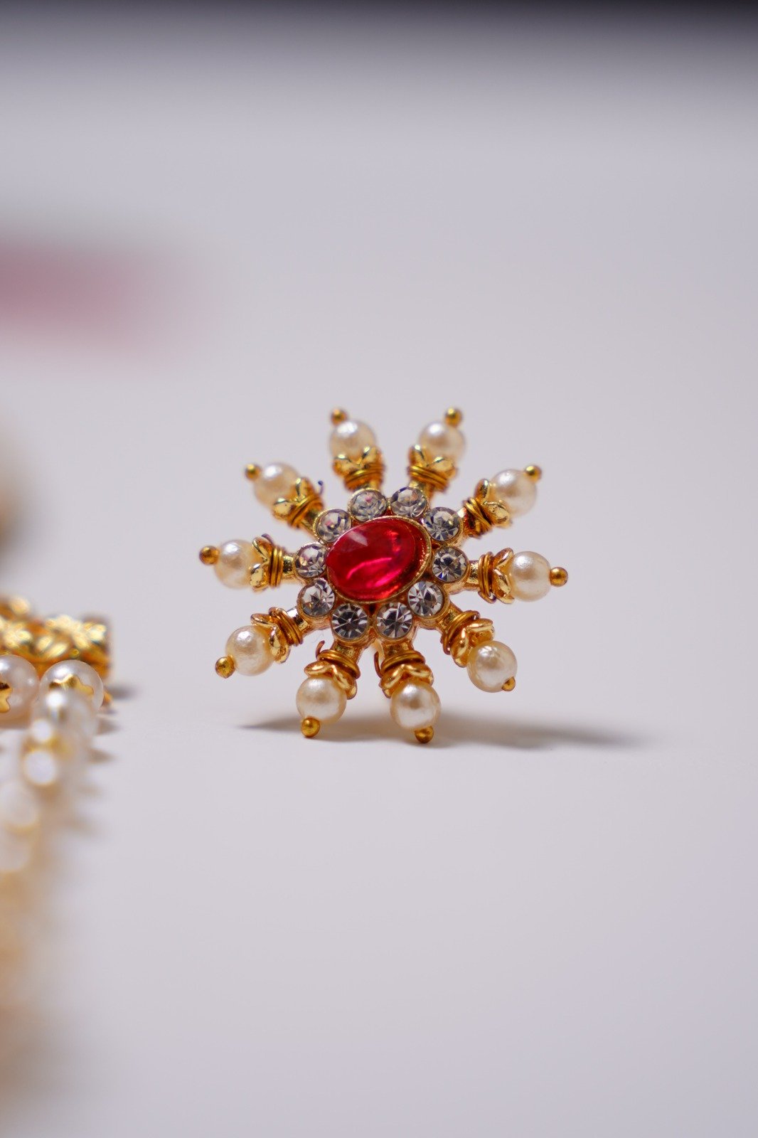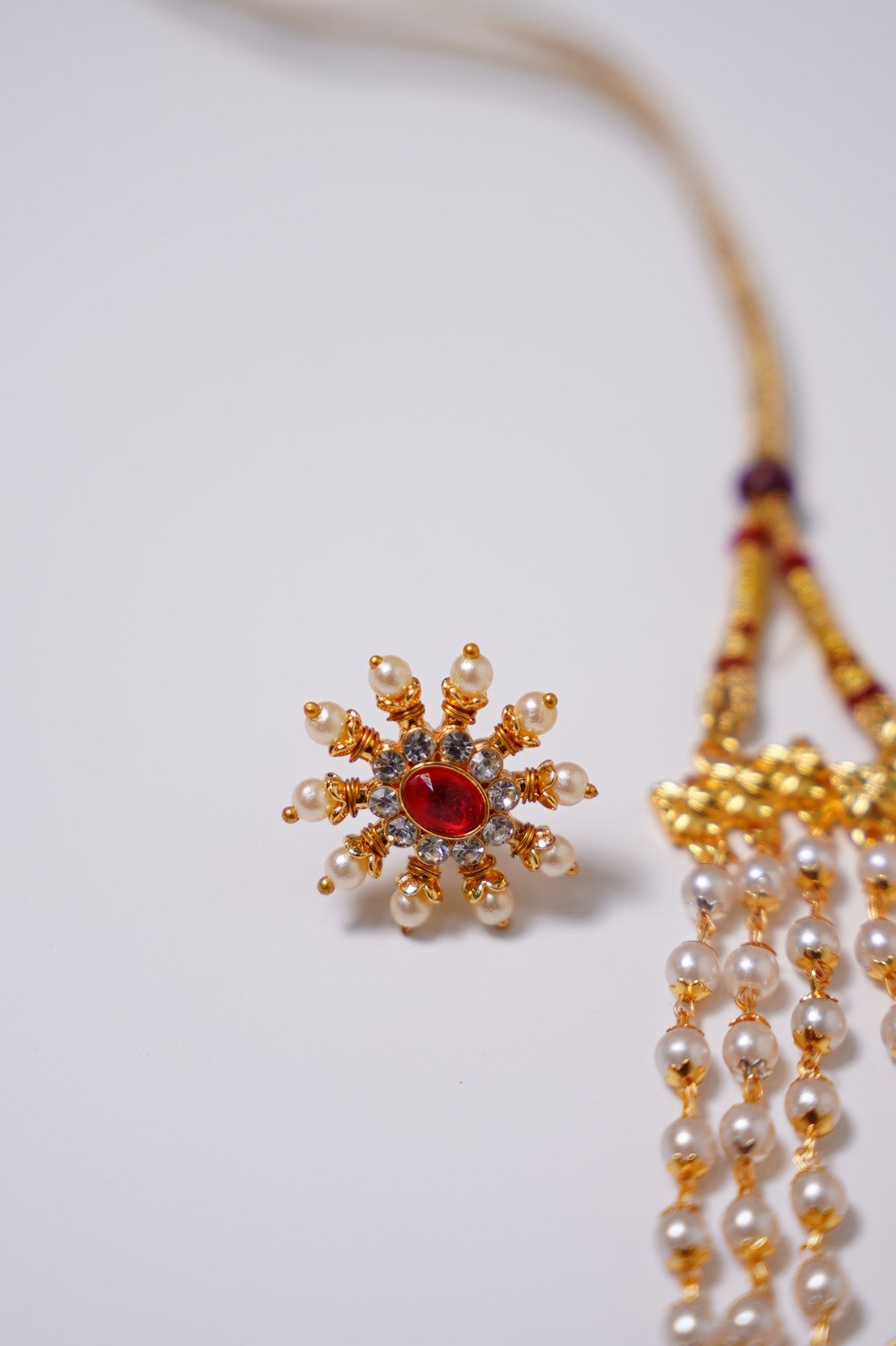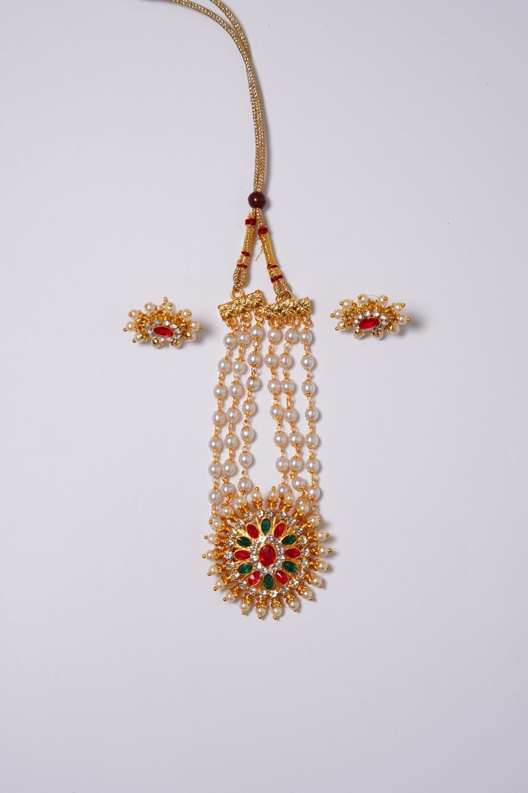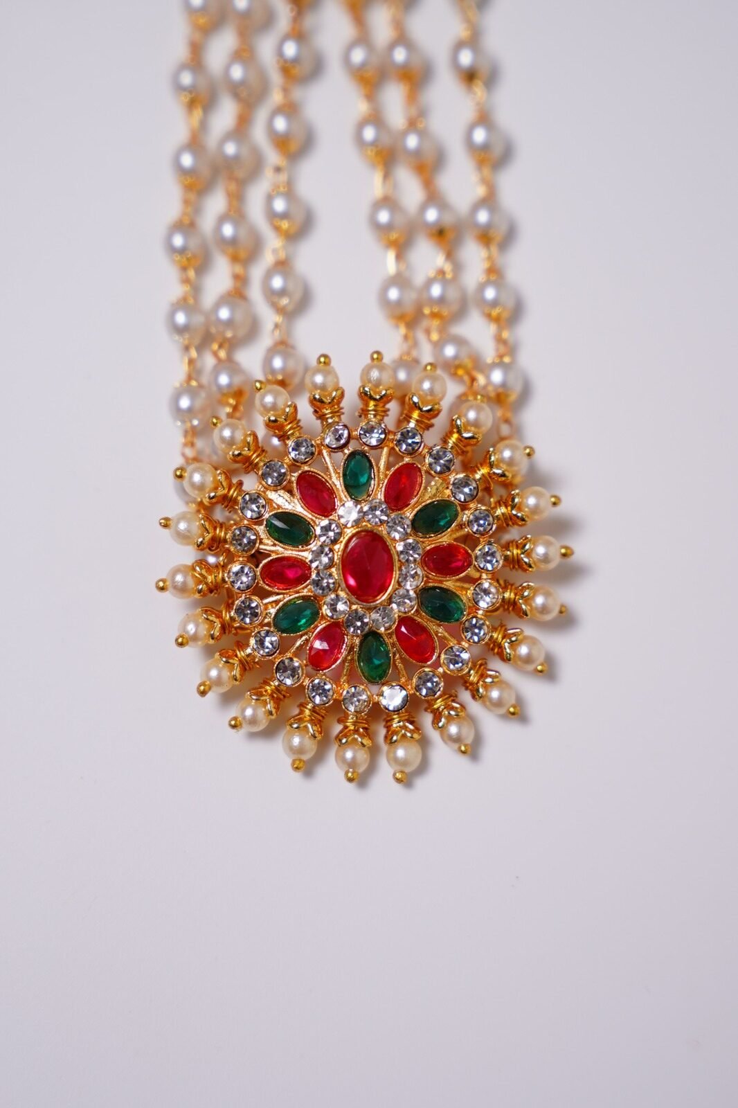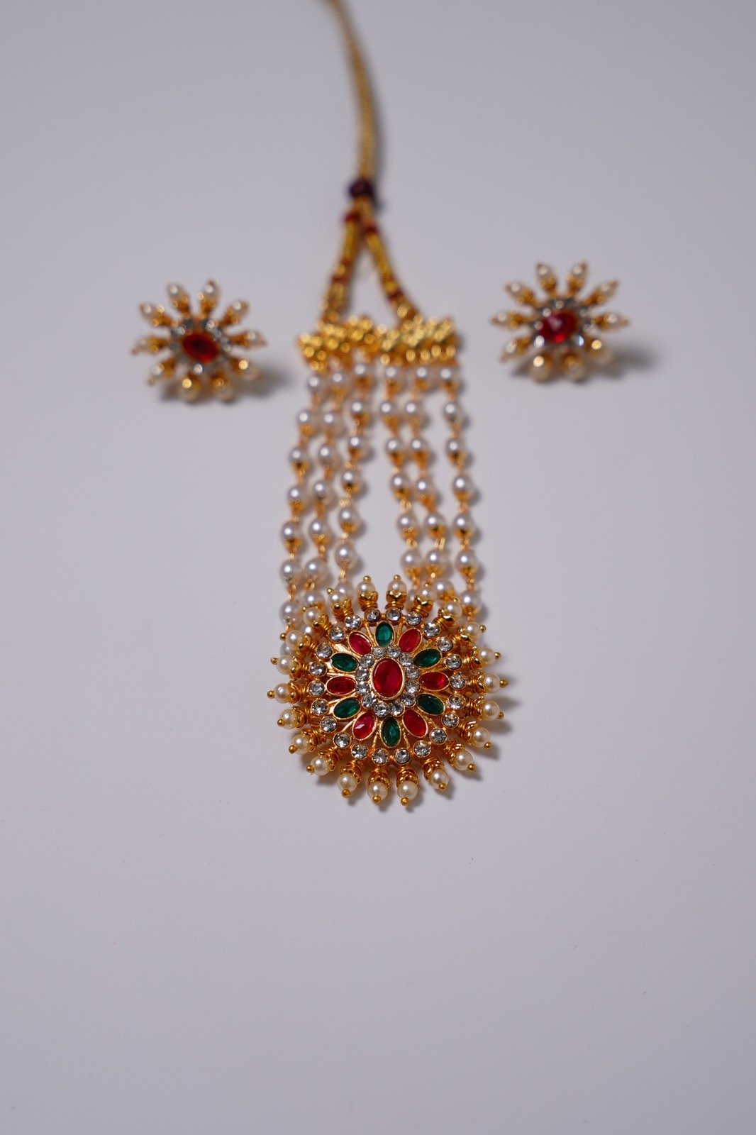 The set is completed with a secure clasp and is often paired with matching earrings featuring kemp stones and pearl drops. Elegant and culturally rich, the Kemp Chakra Pendant 3 Line Pearl Mala Set is ideal for weddings, temple visits, classical dance performances, and festive occasions, beautifully complementing silk sarees and traditional attire.