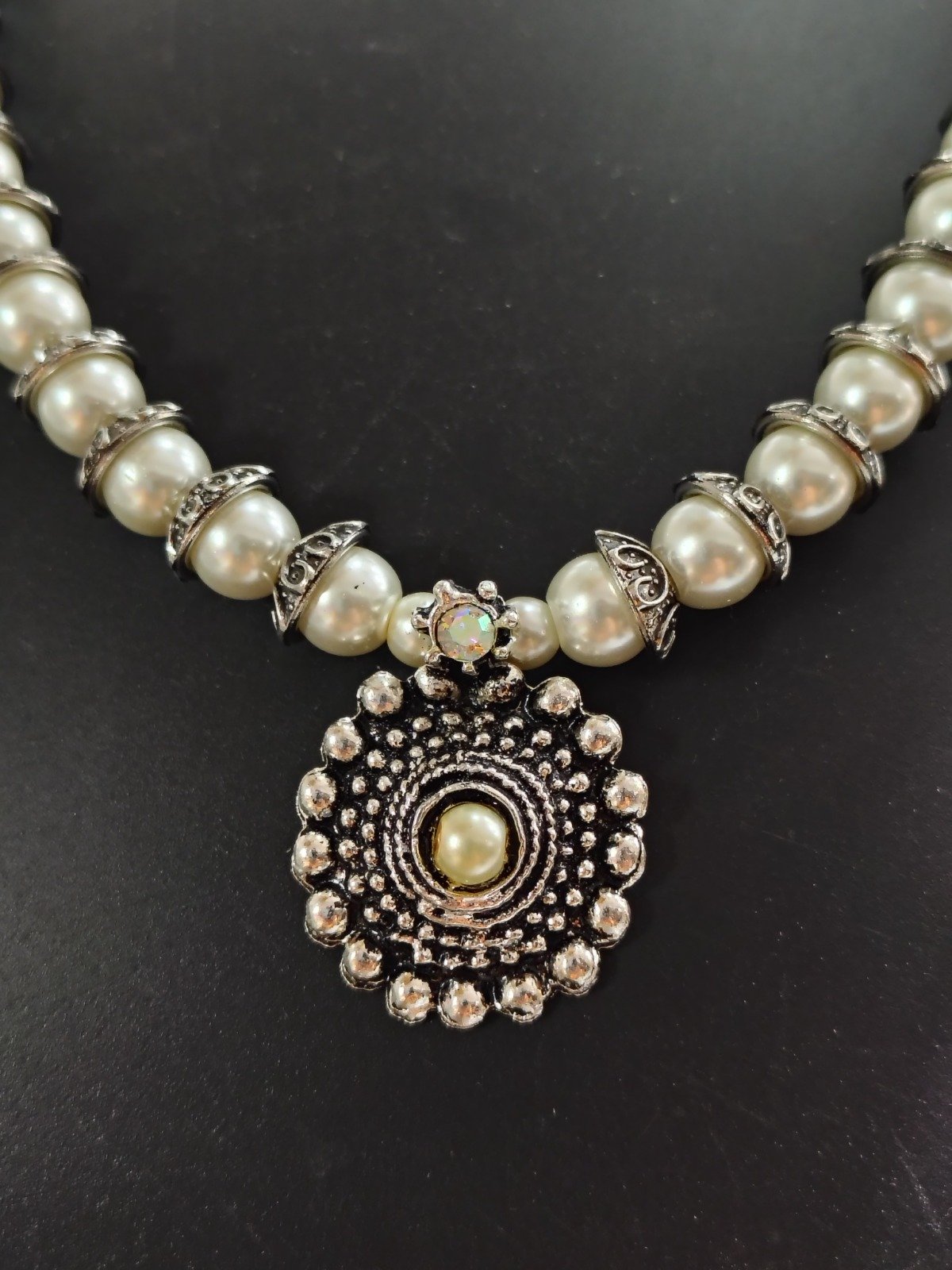 This elegant necklace set features a timeless strand of ivory-toned pearls delicately spaced with ornate oxidised silver accents, creating a refined yet traditional look. The centerpiece is a beautifully crafted round oxidised silver pendant, detailed with intricate patterns and finished with a soft pearl at its heart, adding vintage charm and sophistication.
