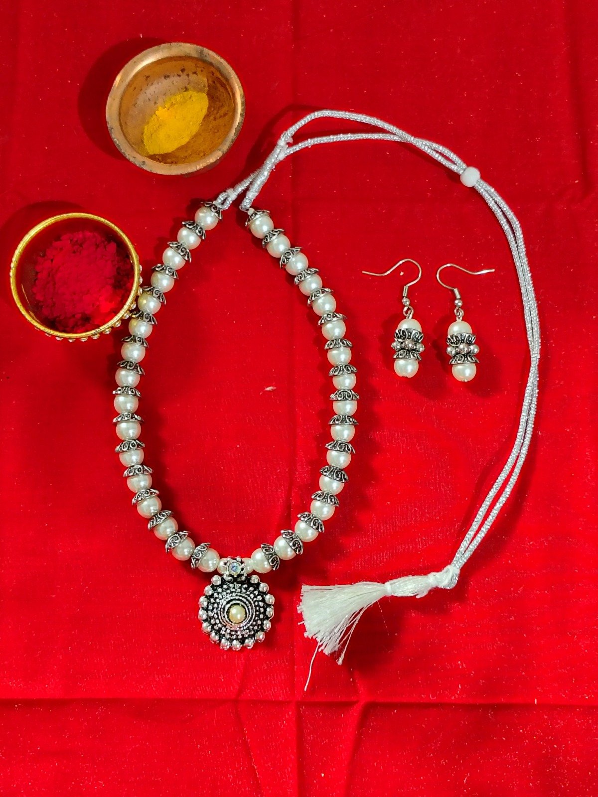 The set is complemented by matching drop earrings, designed with pearl detailing and oxidised silver elements that perfectly echo the necklace’s craftsmanship. The subtle antique finish makes this set versatile and effortlessly stylish.