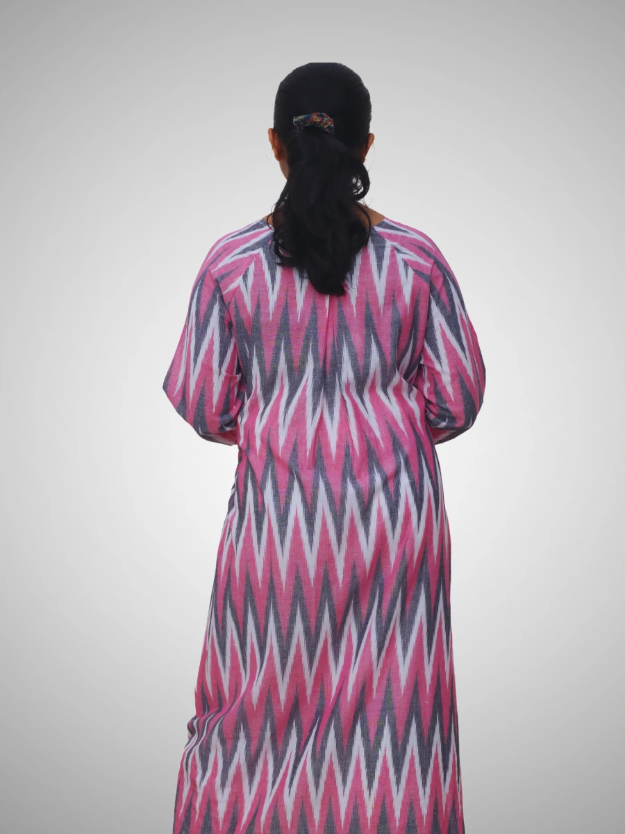 An Ikat long kurta is a traditional yet contemporary outfit crafted from handwoven Ikat fabric, featuring vibrant, blurred patterns. Its comfortable fit and elegant design make it ideal for casual, festive, or formal occasions.