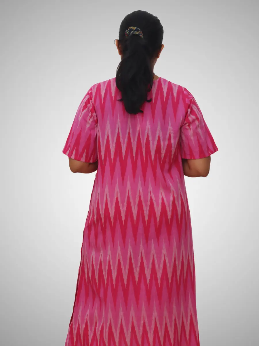 An Ikat long kurta is a traditional yet contemporary outfit crafted from handwoven Ikat fabric, featuring vibrant, blurred patterns. Its comfortable fit and elegant design make it ideal for casual, festive, or formal occasions.