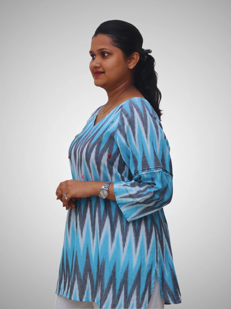 An Ikat weaving top is a trendy garment made from handwoven Ikat fabric, featuring unique, blurred patterns created through a traditional dyeing technique. Comfortable and stylish, it’s perfect for both casual and semi-formal wear.