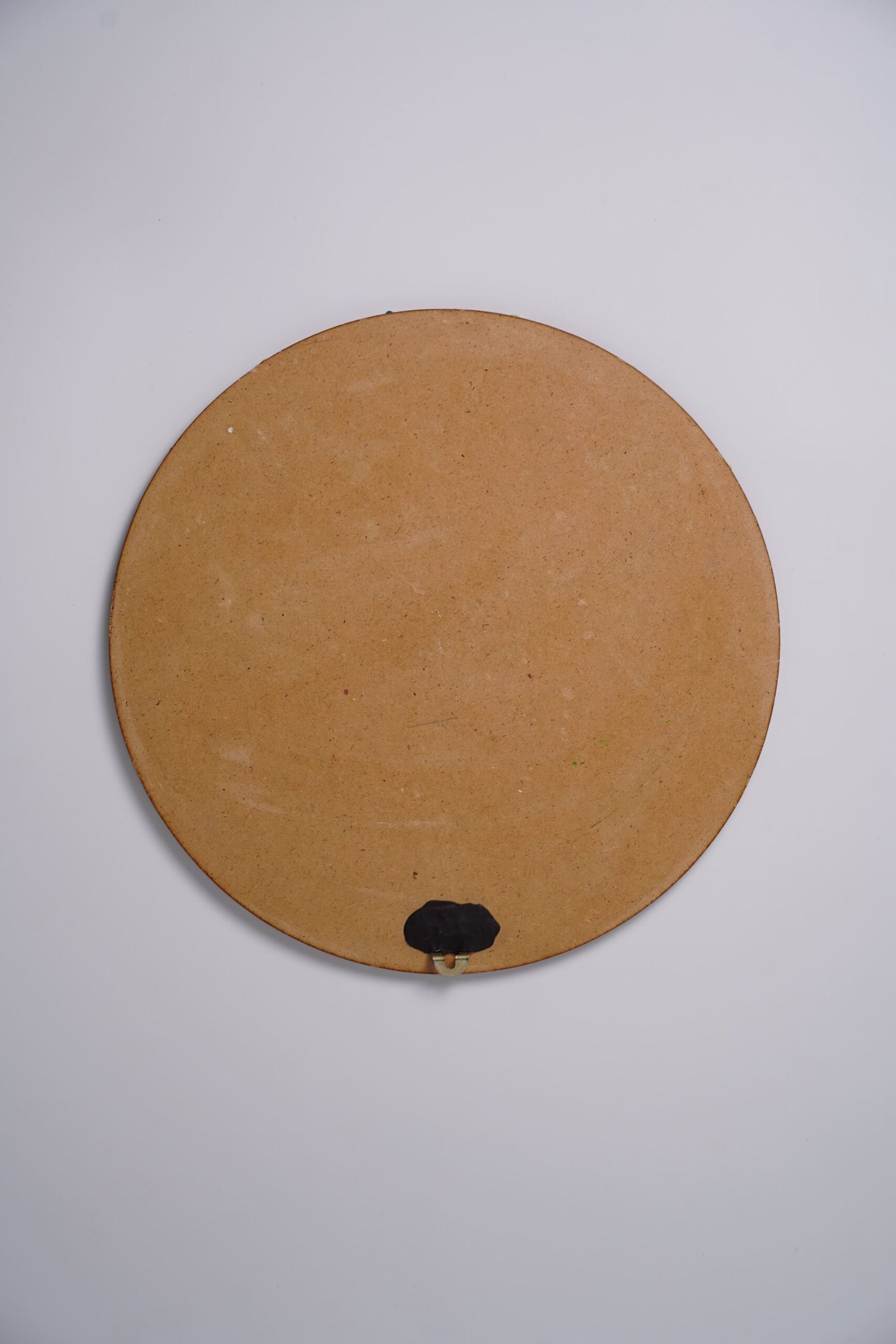 This image showcases a handcrafted decorative wall plate, designed with vibrant colors and intricate detailing. The round base is painted in a warm terracotta orange, symbolizing earthiness and tradition, while the layered design adds depth and visual appeal.