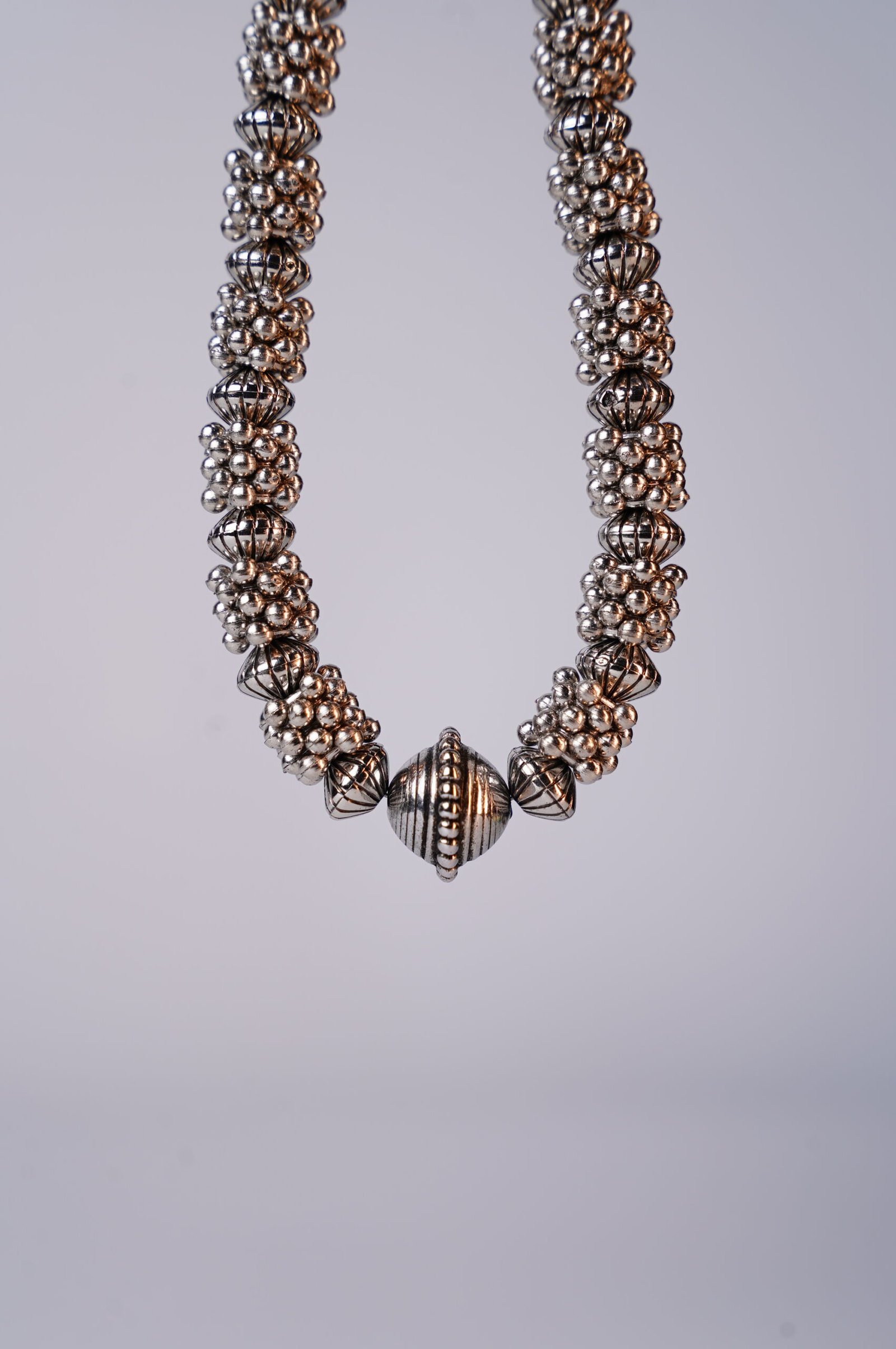 Add a touch of traditional charm to your jewelry collection with this oxidized silver-tone beaded necklace set, complete with matching earrings. Featuring intricately arranged beads and a classic oxidized finish, this set exudes a timeless, handcrafted appeal. Perfect for ethnic wear, boho styles, or fusion outfits, it adds depth and character to both casual and festive looks. A versatile accessory set that brings understated elegance and cultural flair to any ensemble.
