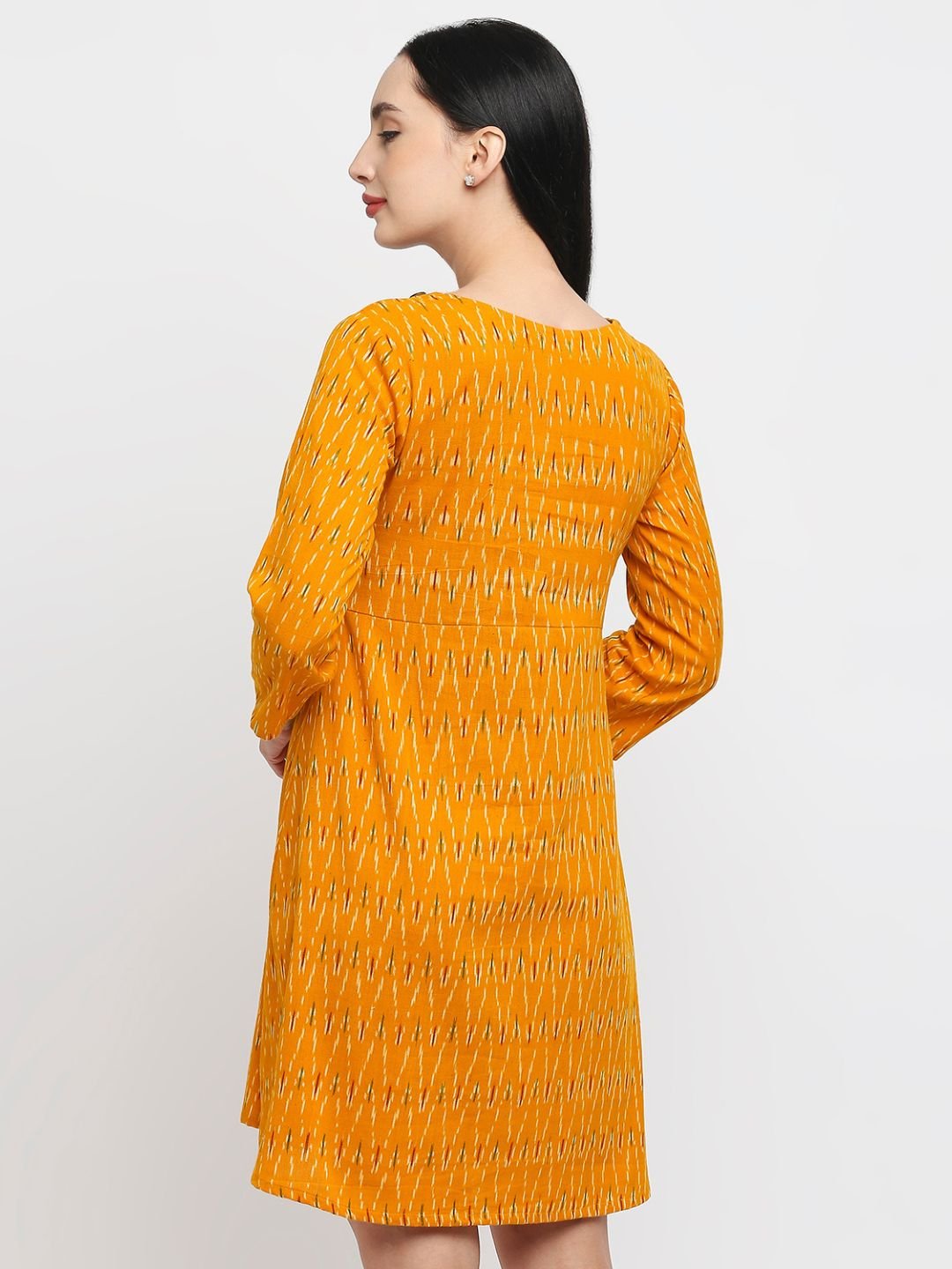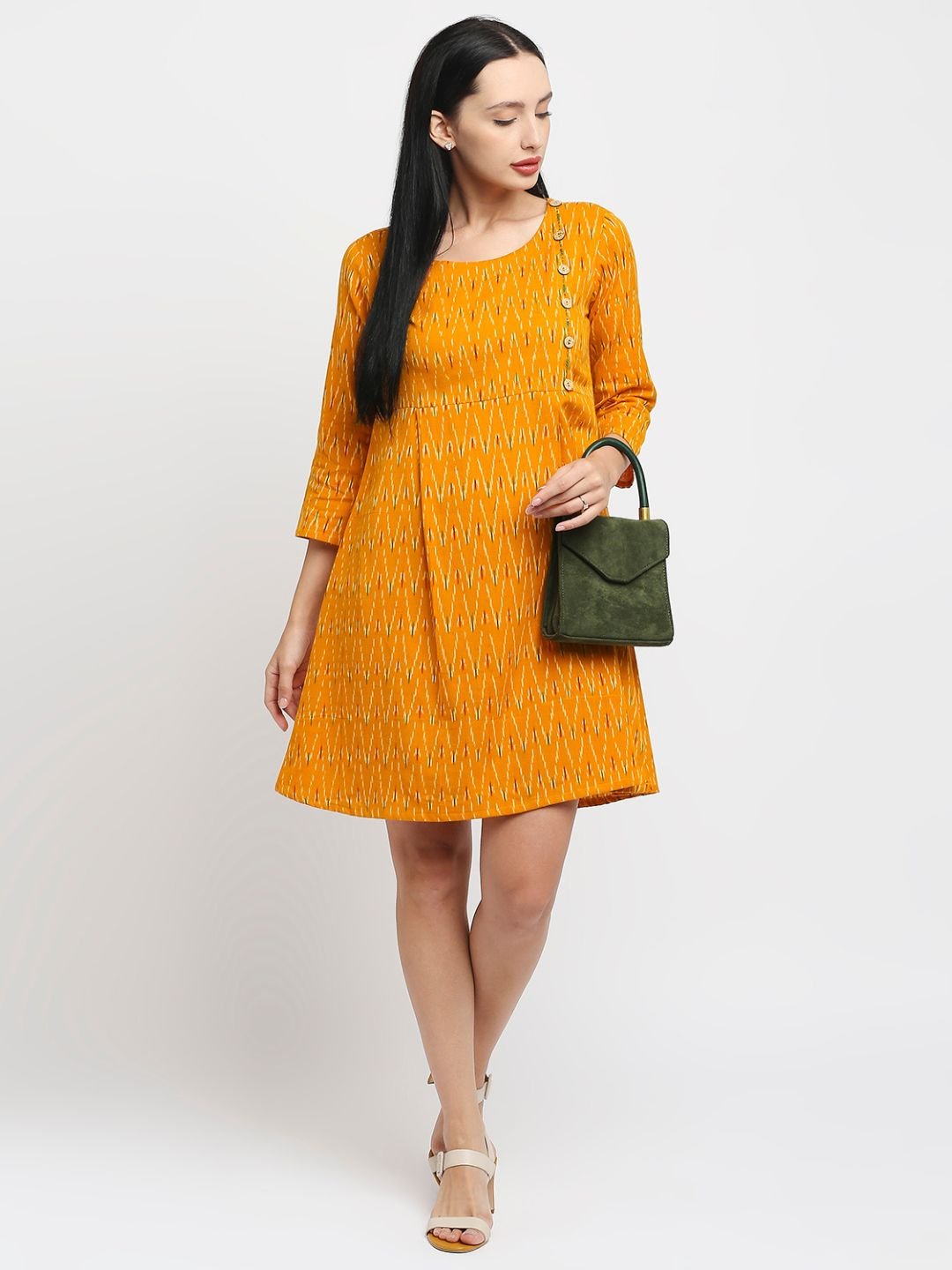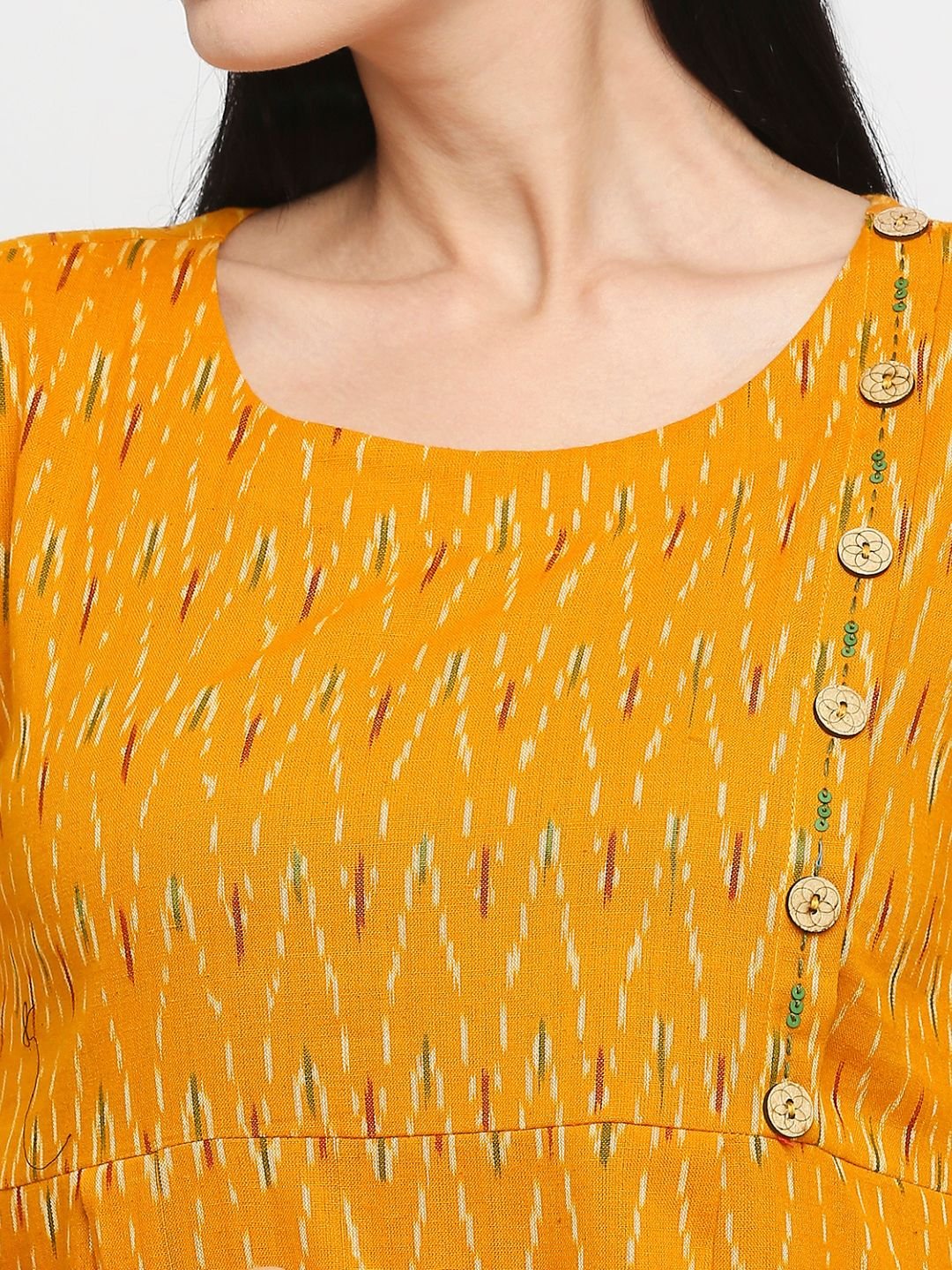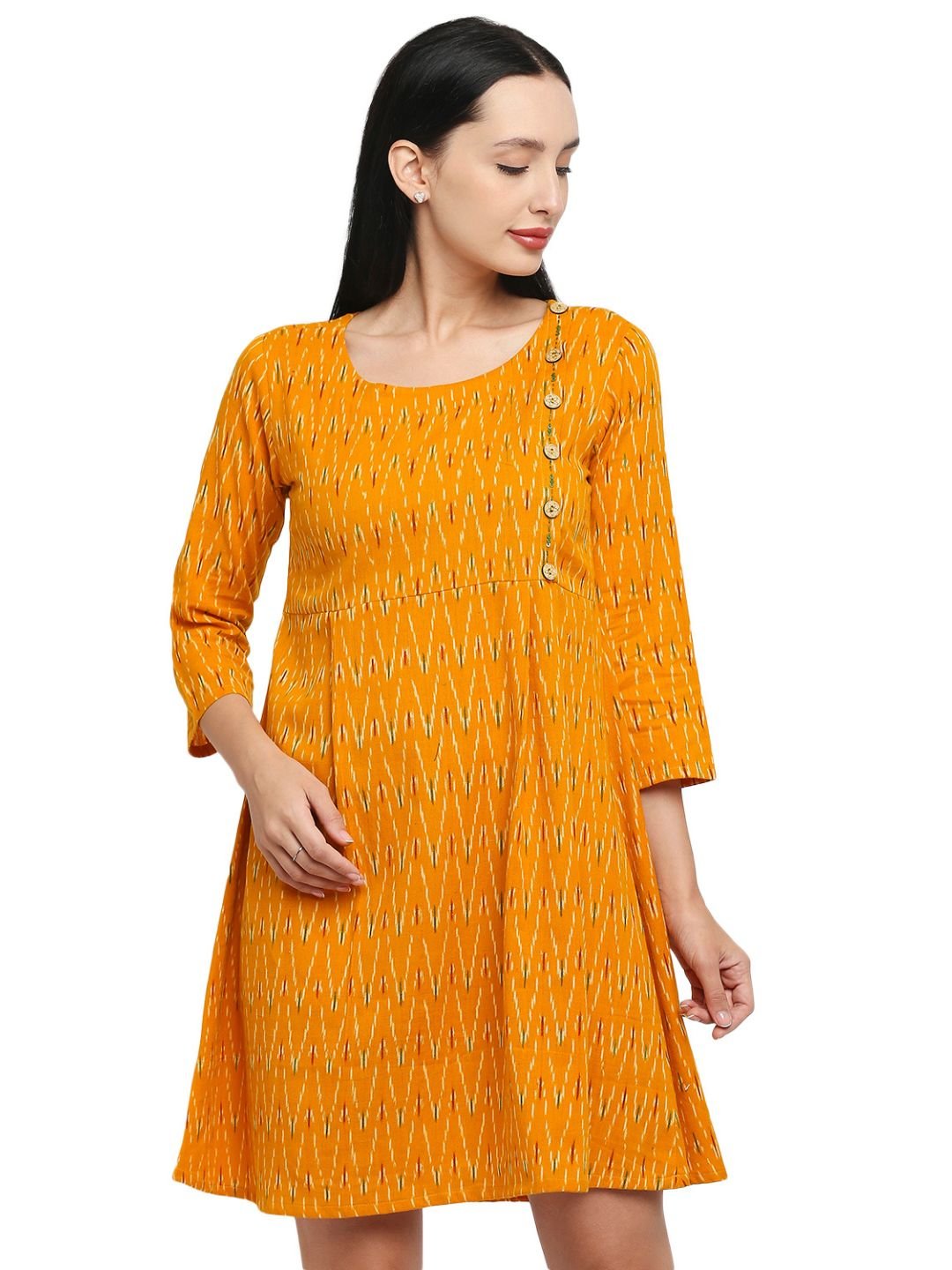 Tisser’s mustard yellow midi handwoven dress with a round neck and 3/4 sleeves, crafted from ikat material. It features stylish button embellishments on one side, ideal for a summer look that’s both trendy and comfortable. |