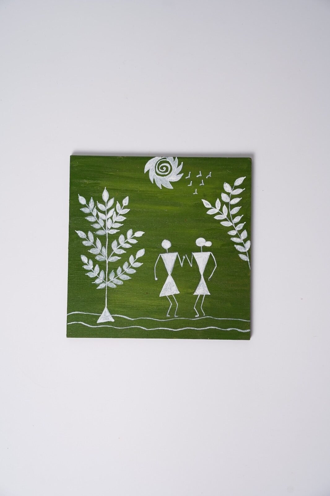This canvas Warli art is a beautiful representation of India’s ancient folk painting tradition, originating from the Warli tribes of Maharashtra. Painted in a minimalist style, the artwork features white hand-painted motifs on a deep green background, a modern adaptation of the classic Warli palette.
