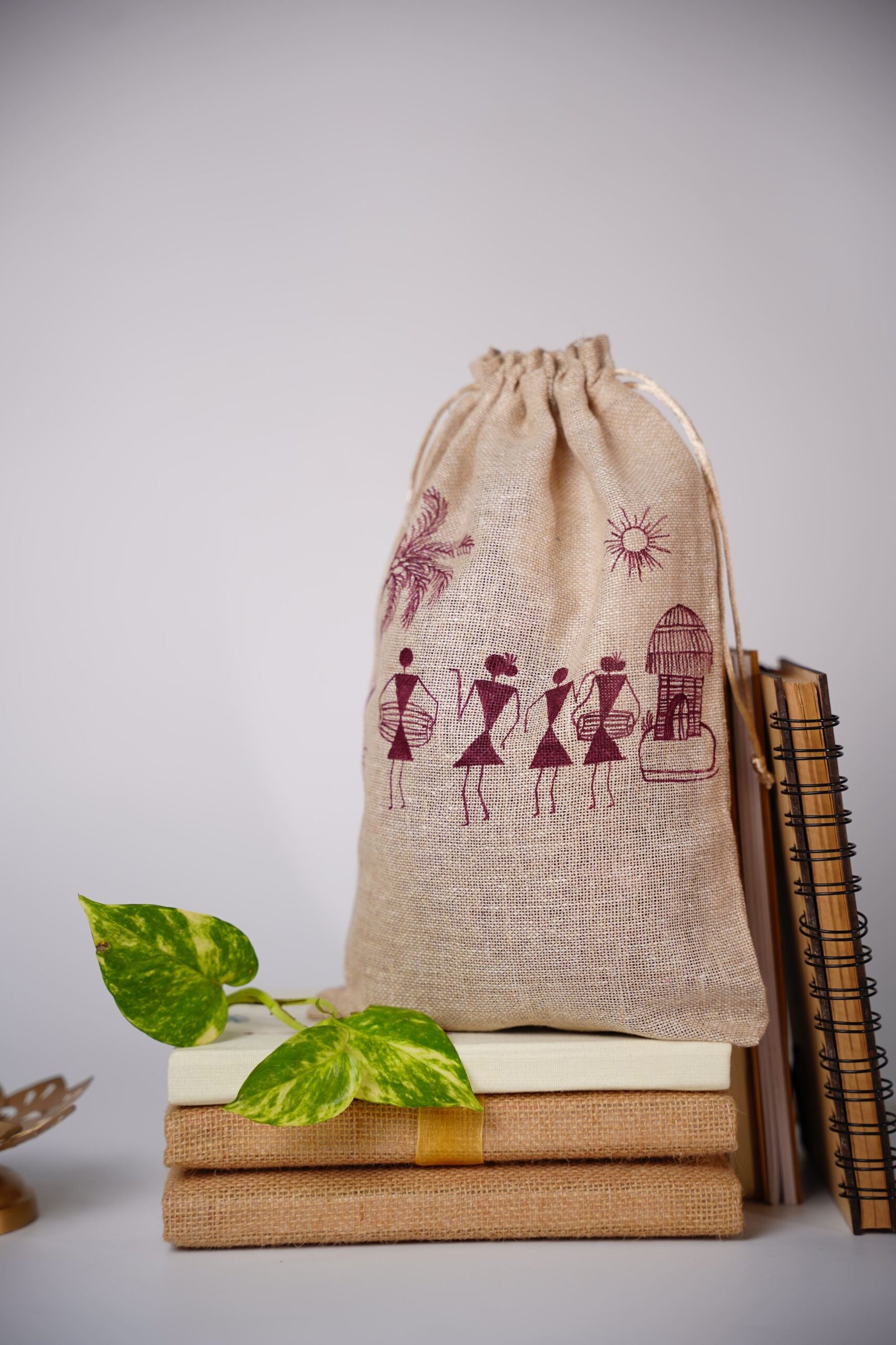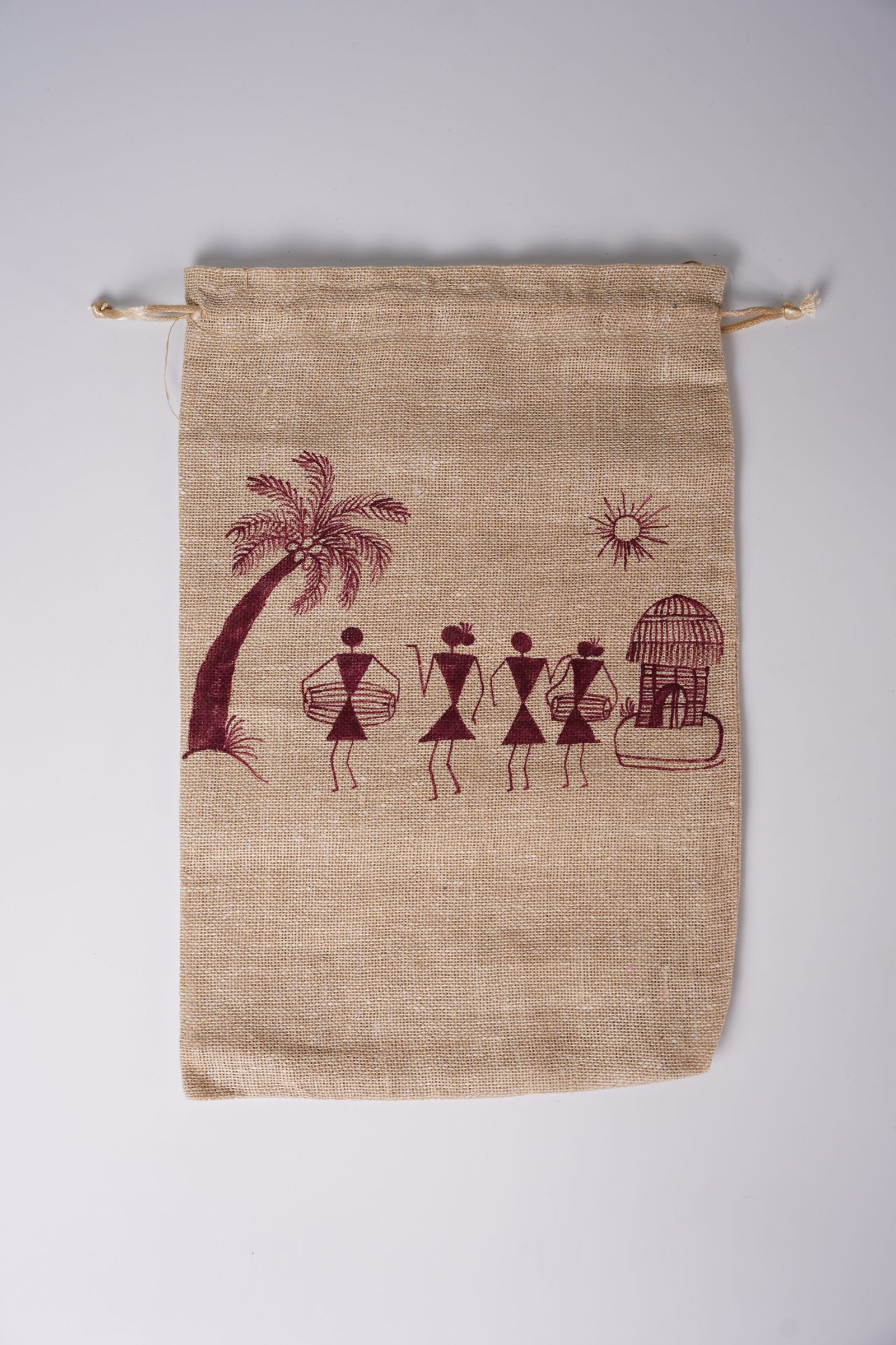 This Warli art jute pouch bag is a charming blend of eco-friendly materials and traditional folk art. Made from natural jute fabric, the pouch has a raw, earthy texture that reflects sustainability and handcrafted appeal.