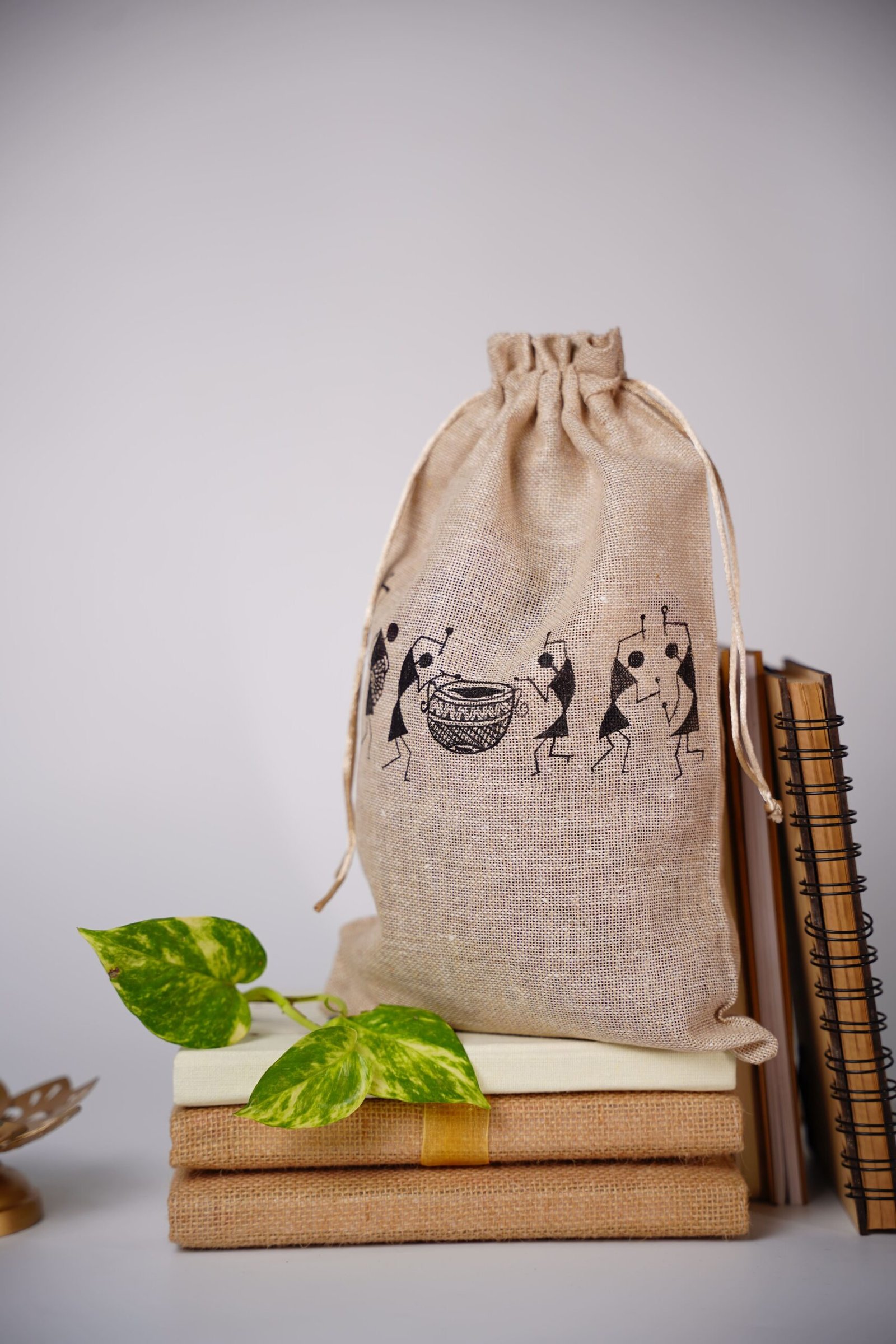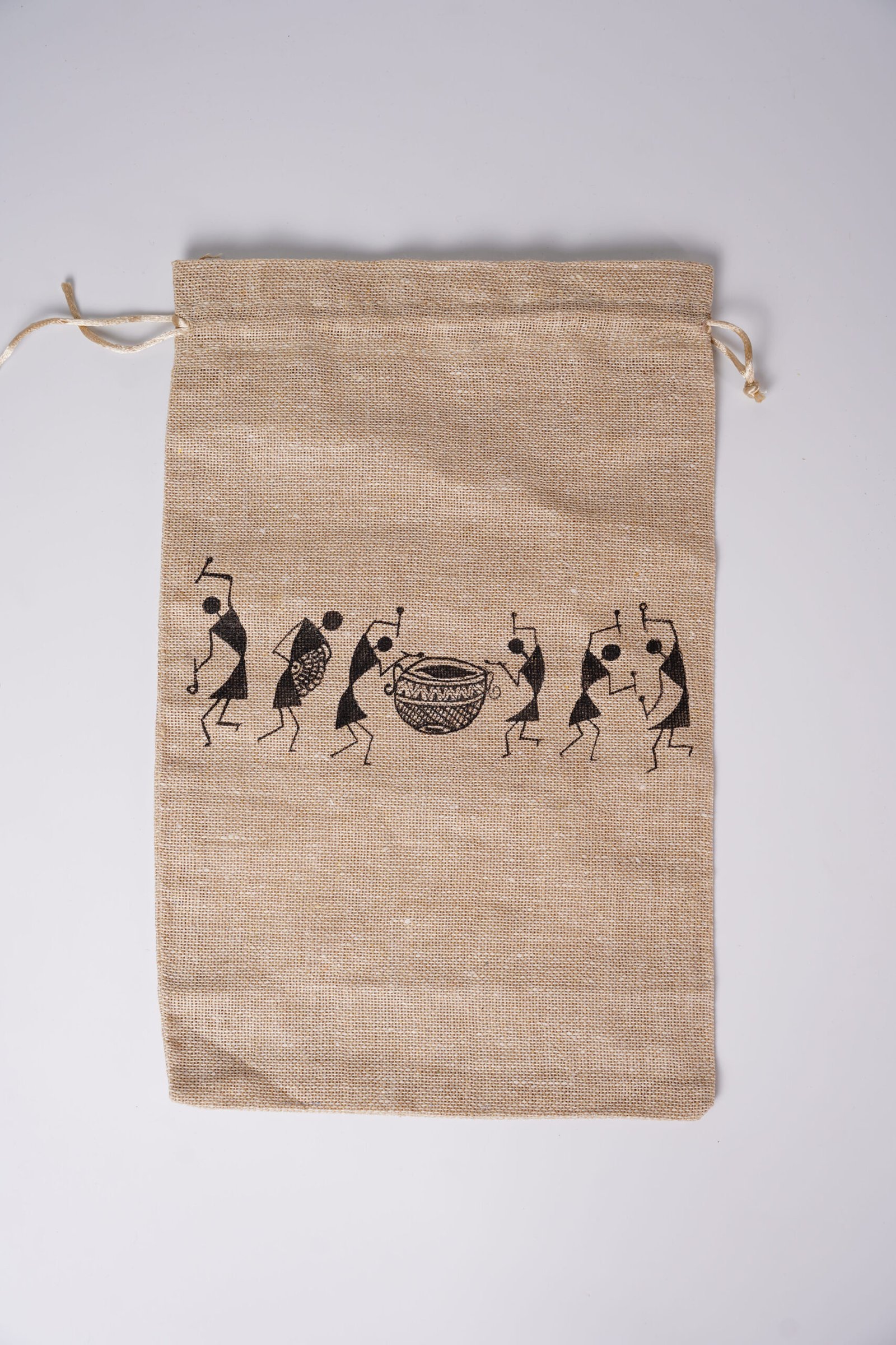 Warli Hand-printed Jute Pouch (Set Of 5)Warli Hand-printed Jute Pouch (Set Of 5)