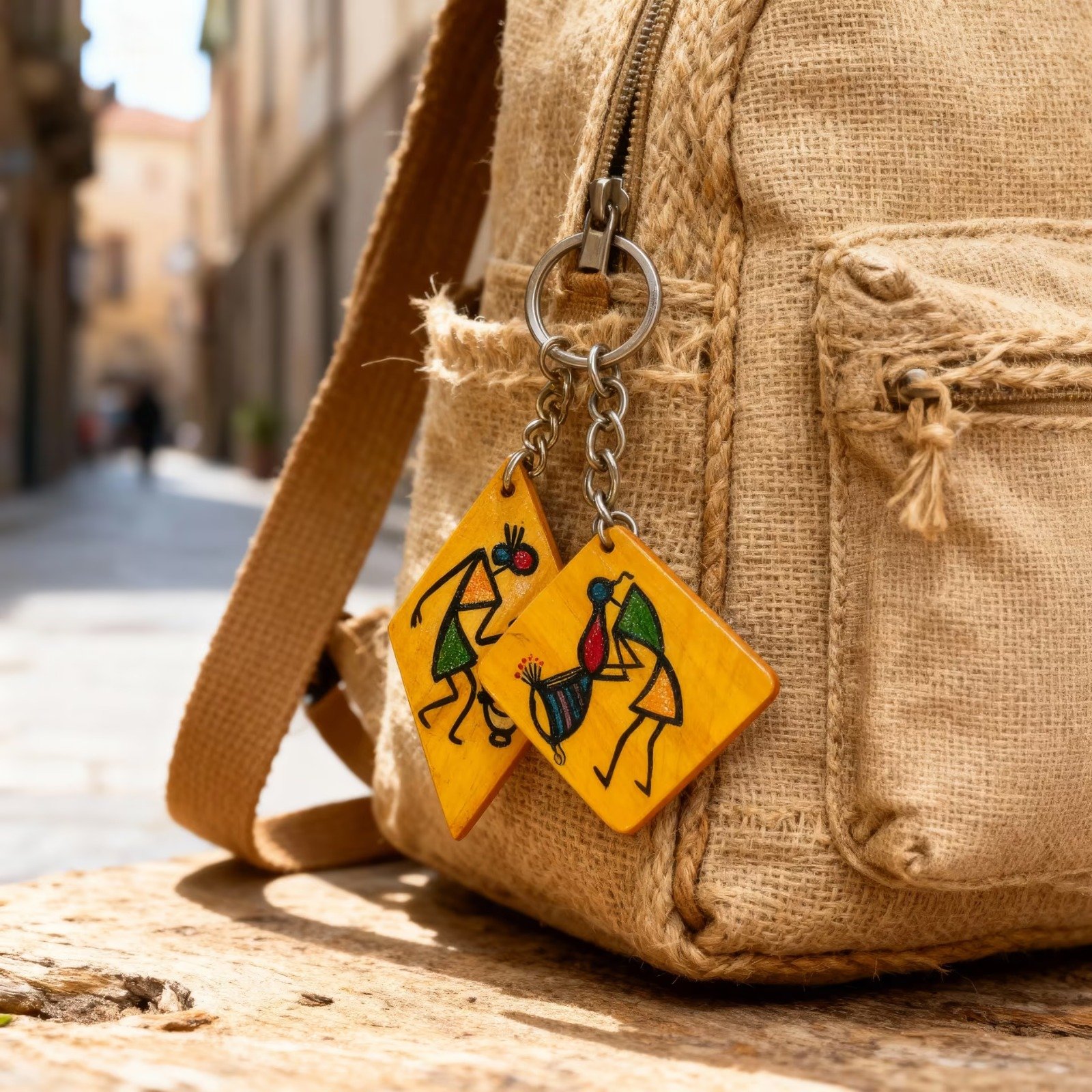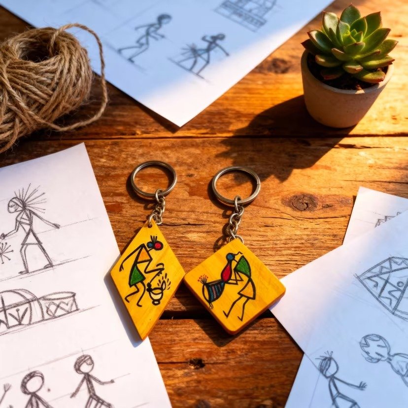 Unleash your inner artist and embrace the beauty of traditional craftsmanship with our unique set of keychains. These charming accessories are not just ordinary keychains; they are miniature works of art, inspired by the rich heritage of tribal Warli art. Each keychain features a square/diamond-shaped pendant, meticulously hand-painted with vibrant dancing figures, bringing a touch of ethnic charm to your everyday life.