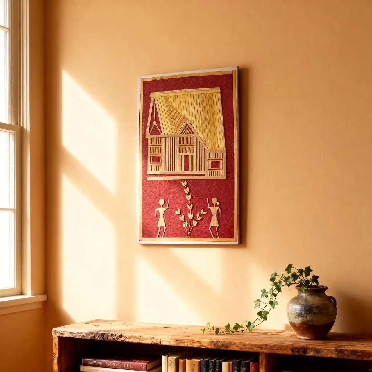 This wooden wall art is a beautiful piece of home decor that brings warmth and character to any room. Made from natural bamboo and wooden slats arranged in a traditional folk art style, it features a charming house design with two human figures and a plant motif set against a rich red background. The piece comes with a light wooden frame that adds a polished finish while keeping its rustic appeal. Perfect for living rooms, bedrooms, offices, or hallways, this decorative panel works great with neutral and earthy interior styles. It’s a handcrafted item that tells a story through its simple yet meaningful design. The natural wood materials make it an eco-friendly choice for anyone looking to add cultural and artistic value to their walls without using plastic or synthetic materials.